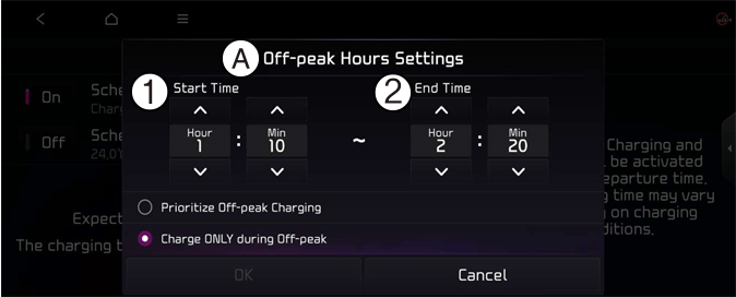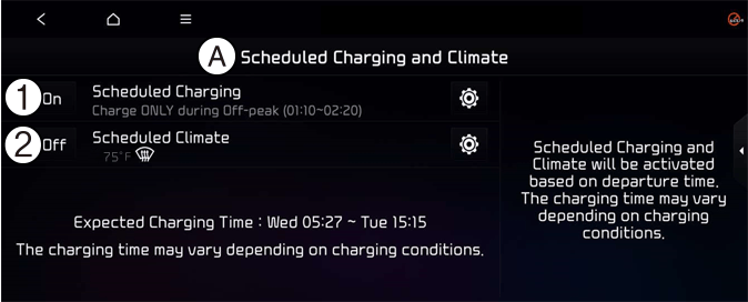 You can set the date and time of when to charge the battery and the climate control temperature. Also, you may select the time to start charging using the Off-peak time settings.