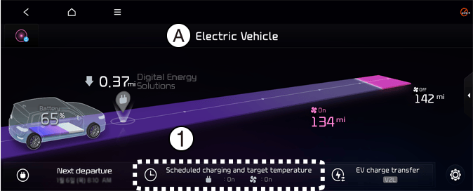 If the target temperature (1) is set with the cable connected, the cabin temperature will be adjusted to the target temperature at departure time. In cold weather, pre-scheduled heating helps enhance electric vehicle performance by heating the vehicle in advance.