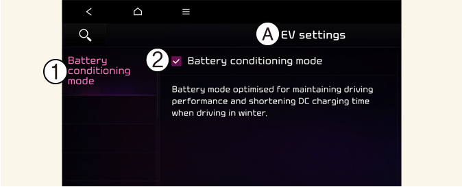 The Battery conditioning mode is efficient during the winter time when the high voltage battery temperature is low. This mode is recommended to improve driving and DC charging performances during winter. However, the driving distance may be reduced as more energy is required to increase battery temperature.