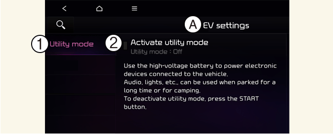 The Utility mode can be deactivated by pressing the EV button to the OFF position. The function cannot be deactivated from the EV settings.