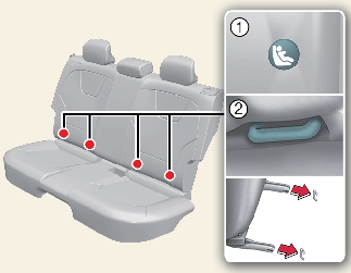 LATCH anchors have been provided in the left and right outboard rear seating positions. Their locations are shown in the illustration. There are no LATCH anchors provided for the center rear seating position.