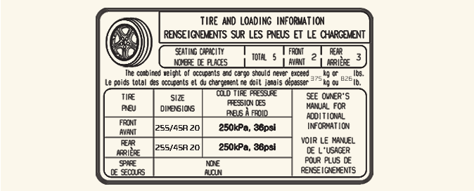 The label located on the driver's side center pillar sill gives the original tire size, cold tire pressures recommended for your vehicle, the number of people that can be in your vehicle and vehicle capacity weight.