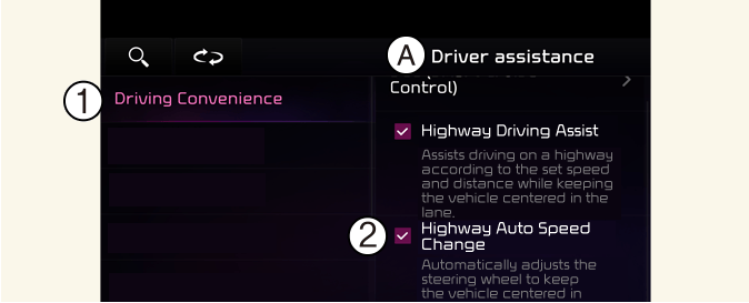 With the vehicle on, touch Settings → Vehicle → Driver Assistance → Driving convenience → Highway Auto Speed Change on the infotainment system.