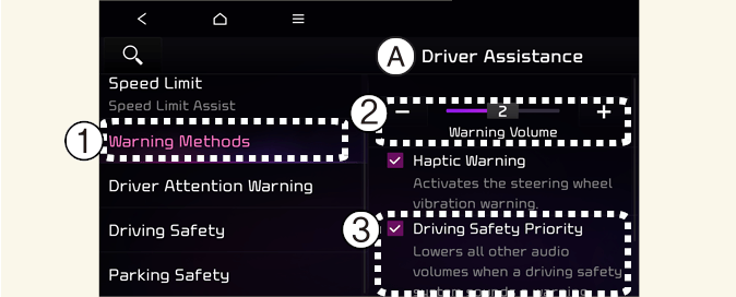 Driving safety priority: Select Settings → Vehicle → Driver assistance → Warning methods → Driving Safety Priority on the infotainment system. The audio volume is reduced for safe driving while a warning sounds.