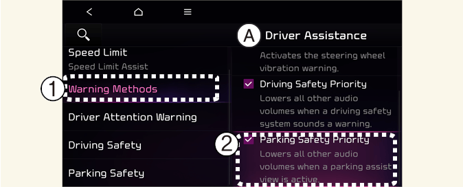 Ensure that Warning methods you have set may apply to the Warning methods of other driver assistance systems.