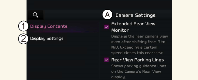 Display Contents: To change the settings of Rear view parking guide and Extended rear camera use.