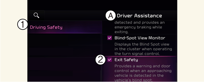 With the vehicle on, touch Settings → Vehicle → Driver Assistance → Driving Safety → Exit Safety on the instrument cluster or Settings → Vehicle → Driver Assistance → Driving Safety → Exit Safety on the infotainment system.