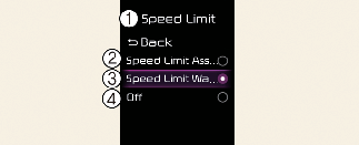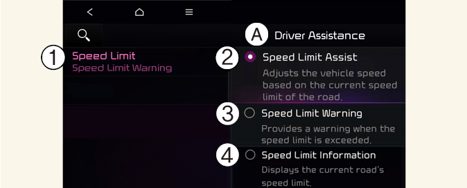 Speed Limit Warning: Intelligent Speed Limit Assist will inform the driver of speed limit and additional road signs. In addition, Intelligent Speed Limit Assist will warn the driver when the vehicle is driven faster than the speed limit. Manual Speed Limit Assist or Smart Cruise Control (If equipped) set speed will not be automatically adjusted. The driver should adjust the speed manually.