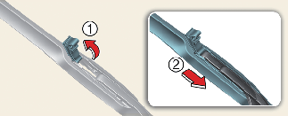 Lift the wiper blade clip up (1). Pull down the blade assembly and remove it (2).