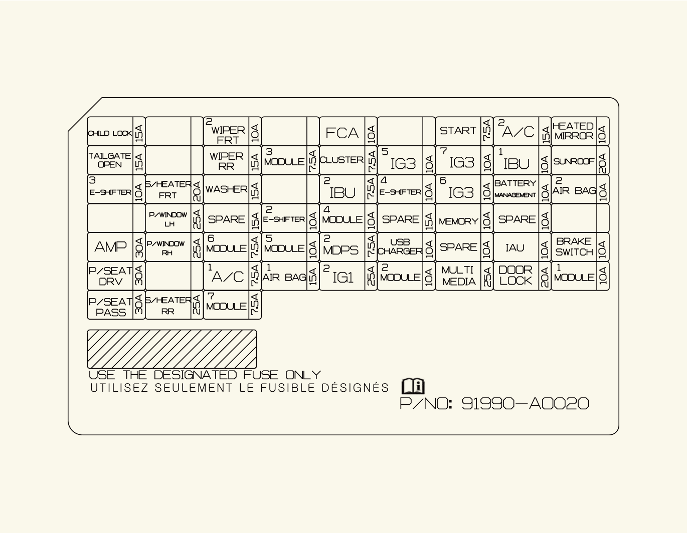 ICU Junction Block (FUSE -MODULE2, USB CHARGER, A/BAG1, IBU2, MDPS2, CLUSTER, MODULE3, MODULE4, MODULE5, E-SHIFTER5, FCA, ING1 2 ) |