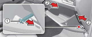 Open the glove box and remove the stopper (1). With the glove box open, remove the glove box by pushing the both sides of it (2).