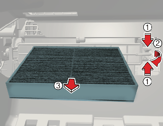 Remove the climate control air filter cover (2) by pulling out both sides (1) of the cover.