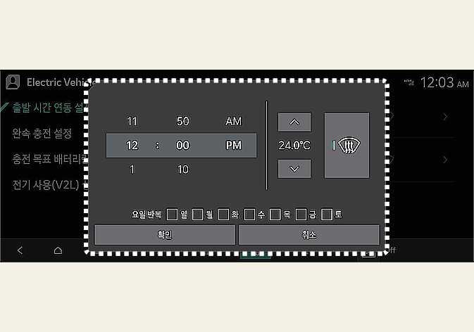 사용자가 선택한 요일의 예약 시간 및 희망 온도에 맞춰 배터리 충전 및 공조 시스템(히터 및 에어컨)이 자동으로 작동될 수 있도록 설정할 수 있습니다. 또한, 예약 충전 할인 시간을 적용하여 충전 시작 시간을 설정할 수 있습니다. |