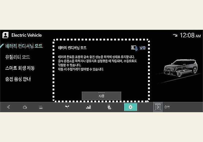 배터리 컨디셔닝 모드는 더운 여름이나 추운 겨울과 같이 고전압 배터리의 온도가 높거나 낮을 때 충전 성능을 상온 수준으로 유지하게 도와주는 기능입니다.