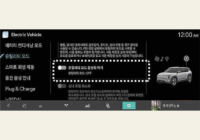 12 V 배터리 대신 구동용(고전압) 배터리를 이용하여 차량 내 여러 편의 장치를 작동합니다. 캠핑, 장시간 정차 등 주행이 필요 없을 때 전기 장치(오디오, 조명 등)를 장시간 사용할 수 있습니다. |