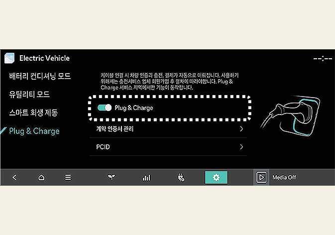전체 메뉴 화면에서 를 선택한 후 Plug & Charge를 눌러 기능을 켜십시오.