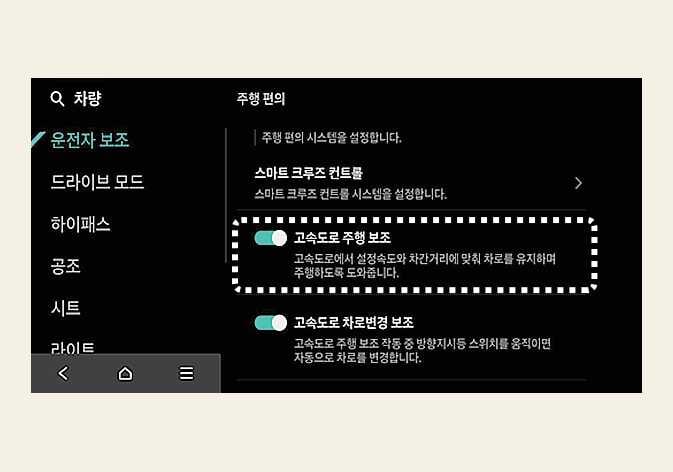 고속도로 차로변경 보조 기능을 선택하면 안전하게 차로를 변경하도록 도와줍니다. |