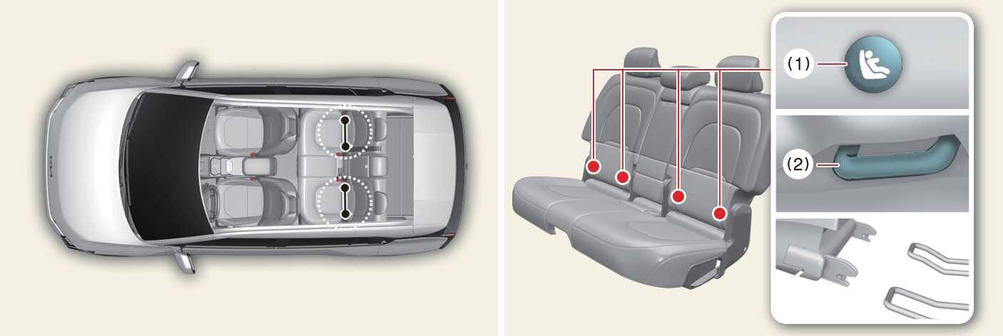 특히 뒷좌석 중앙 좌석은 양 옆의 좌석보다 좁기 때문에 폭이 넓은 어린이 보조 시트를 사용하면 양 옆 좌석의 안전벨트 버클을 가릴 수 있습니다. 이때는 보조 시트의 위치를 조정하거나 버클 사용이 불가능할 경우 해당 좌석에 탑승하지 마십시오.
