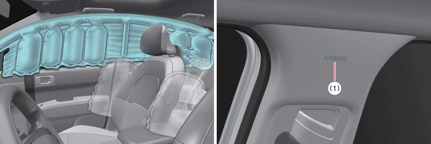 커튼 에어백(1)은 양쪽 도어 위쪽의 천장 끝에 내장되어 있습니다. 에어백 작동 조건이 되면 앞좌석과 뒷좌석 도어 쪽 탑승자의 머리를 보호하기 위해 작동합니다.