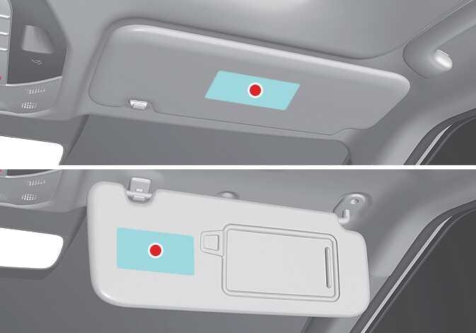 에어백의 위험을 알 수 있게 에어백 경고 라벨이 동승석 선바이저의 앞면과 뒷면에 부착되어 있습니다. 운행 전에 반드시 주의 사항을 숙지하십시오. |