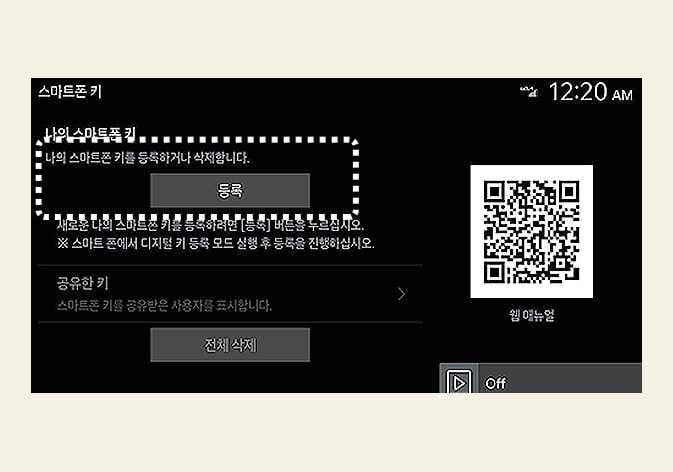차량에 이미 등록된 디지털 키(스마트폰)가 있다면 인포테인먼트 시스템의 스마트폰 키 메뉴 화면에서는 전체 삭제, 나의 스마트폰 키 화면에서는 삭제로 표시됩니다.