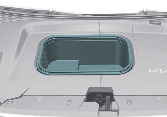 프론트 트렁크 안에 물, 음료 등 액체류 보관 시 주의하십시오. 프론트 트렁크 밖으로 액체가 새어 나올 경우 모터룸 내부에 있는 전기 장치가 손상될 수 있습니다.