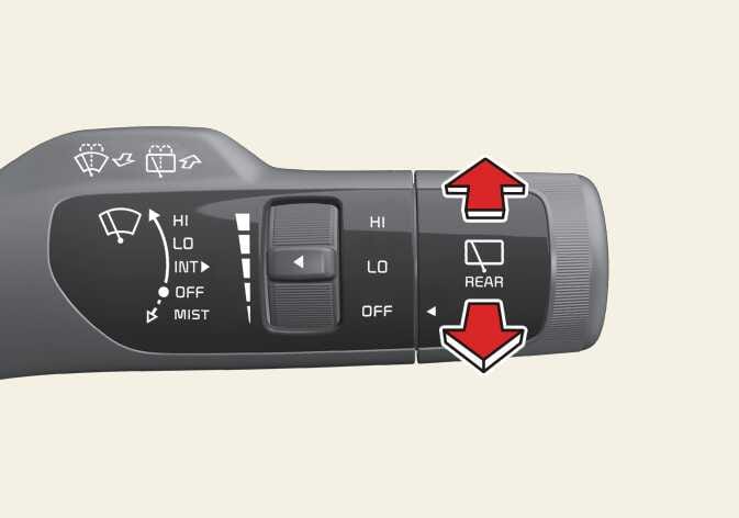 스위치를 운전자 반대 방향으로 밀면 뒷유리에 워셔액이 분출되면서 와이퍼가 여러 번 작동합니다.