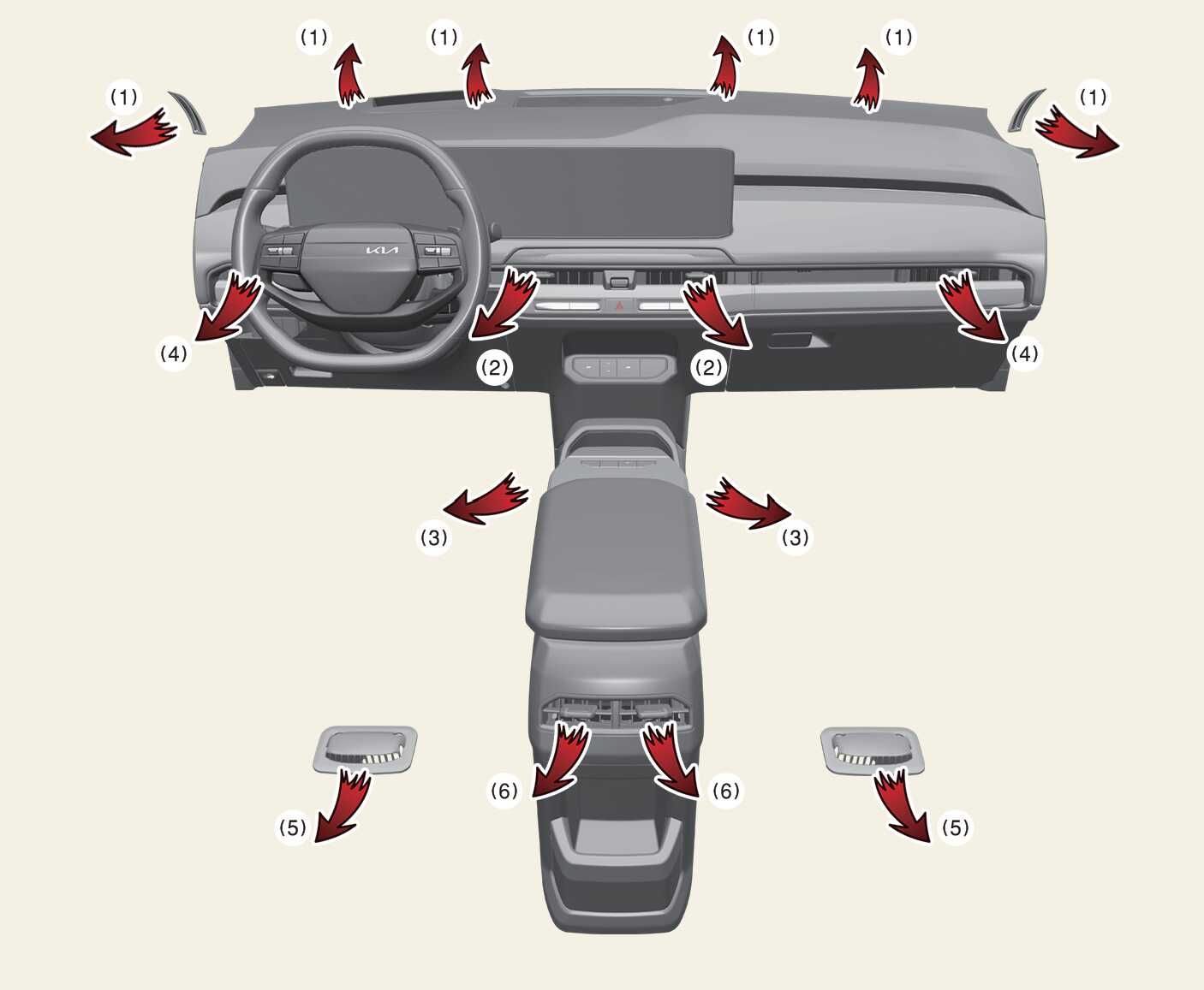 2열 송풍구 바람(5), (6)은 앞좌석 히터 및 에어컨으로 조절하며 송풍구와의 거리가 멀어 앞좌석보다 송풍 속도 및 온도가 약하게 전달될 수 있습니다.