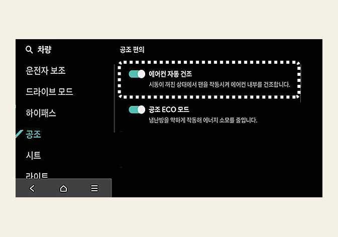 에어컨 자동 건조 기능은 초기 출고 시 기능이 활성 상태로 설정되어 있으므로, 기능을 중지하려면 인포테인먼트 시스템의 설정 메뉴에서 기능을 해제하십시오.