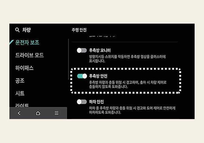 후측방 안전을 해제하면 후측방 충돌방지 보조의 도움을 받을 수 없습니다. 항상 주의하여 운전하십시오.
