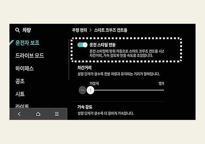 운전자 스타일 연동 활성화 및 비활성 시 표시되는 운전자의 주행 성향(차간거리, 가속 강도, 반응 속도)의 단계가 같더라도 제어되는 성향은 다를 수 있습니다.