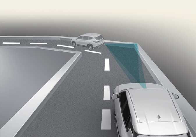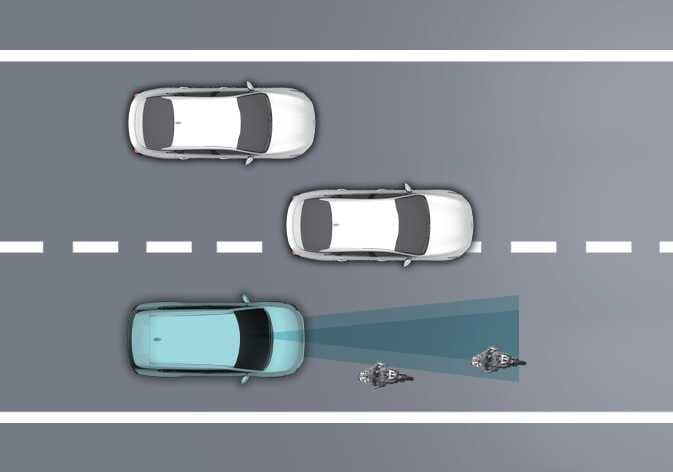 옆 차로의 차량(2)이 자차(1)와 같은 차로로 차로를 변경할 때는 센서의 감지 범위 안으로 들어올 때까지 차량(2)을 인식하지 못할 수 있습니다.