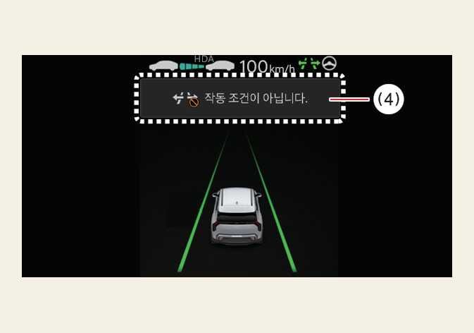 위 (1)번의 고속도로 차로변경 기능 표시등과 동일하게 표시됩니다. 단, 대기 상태인 경우 차선 인지 여부가 표시됩니다.