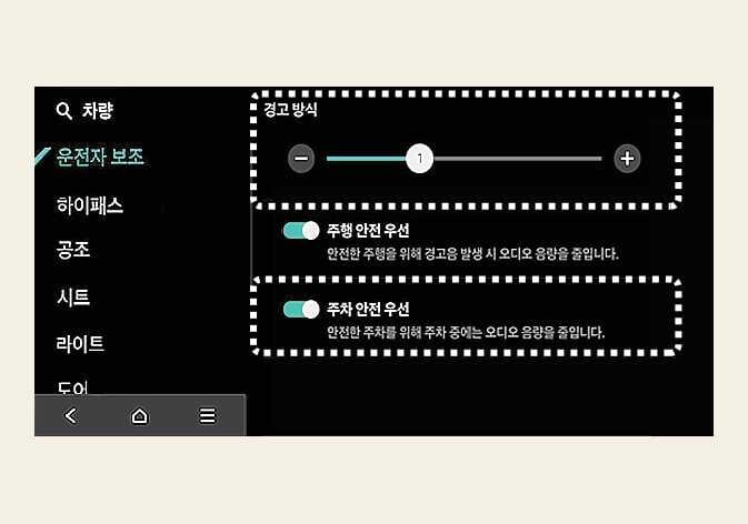 경고 방식은 DRIVE READY 상태에서, 인포테인먼트 시스템의 설정 > 차량 > 운전자 보조를 차례로 선택하십시오. (경고 방식)을 설정할 수 있습니다.