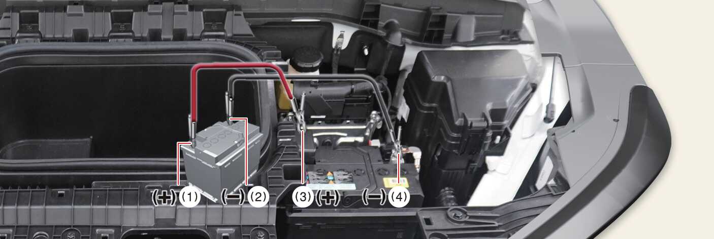 점프 케이블의 (-) 집게 한쪽을 다른 차량이나 보조 배터리의 (-) 단자(2)에 연결하고, (-) 집게 다른 한쪽을 방전된 차량의 (-) 충전 단자(4)에 연결하십시오.