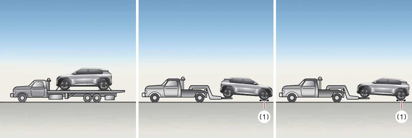 이때, 차량의 변속 위치는 N(중립) 상태이며 주차 브레이크는 해제해야 합니다. 변속 위치 및 주차 브레이크 조작이 불가능한 경우에는 뒷바퀴를 들어 올린 상태로 이동하십시오.