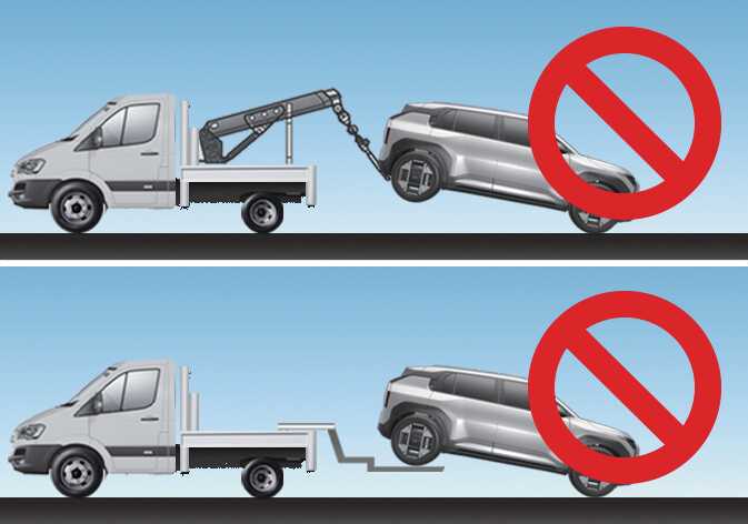 차량을 견인할 때에는 구동 시스템이 포함된 바퀴가 지면에 닿은 상태로 견인하지 마십시오.