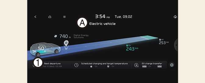 Select EV → Next Departure on the screen. You can set the date and time of when to charge the battery, climate control temperature, and other various functions.
