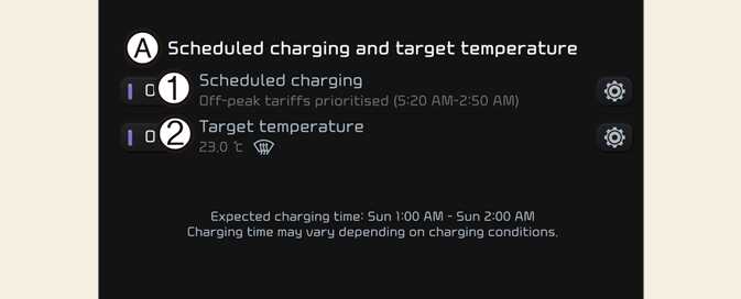 You can set the date and time of when to charge the battery and the climate control temperature. Also, you may select the time to start charging using the off-peak time setting.