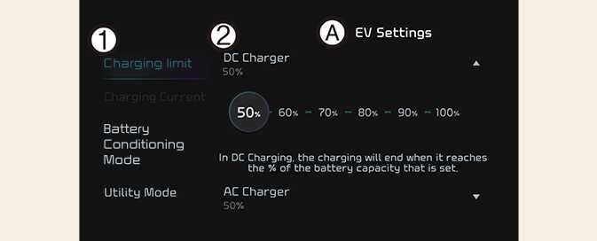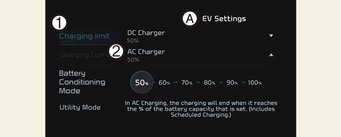 The target battery charge level can be selected when charged with AC charger or DC charger.