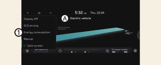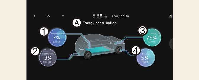 Select Menu → Electricity Use on the screen. You can check the current energy consumption for each system of the vehicle.