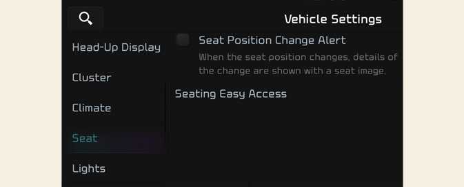 Select Setup → Vehicle → Seat from the Settings menu in the infotainment system screen, you may use various convenience functions.