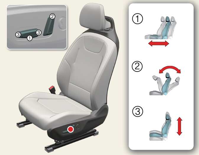 Before driving, adjust the seat to the proper position so you can easily control the steering wheel, pedals and switches on the instrument panel.