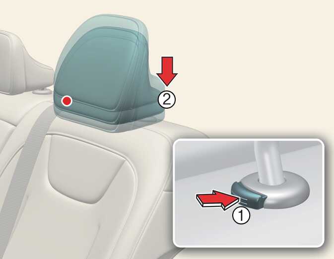 Lower the rear headrests to the lowest position by pressing the headrest release button (1) while pulling the headrest down (2).