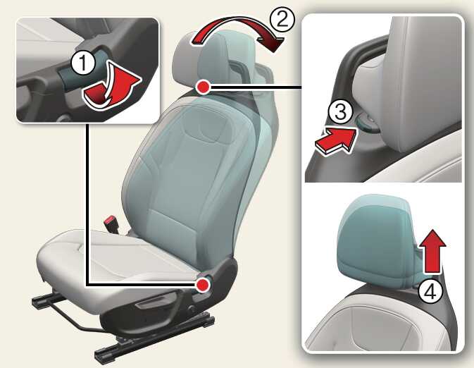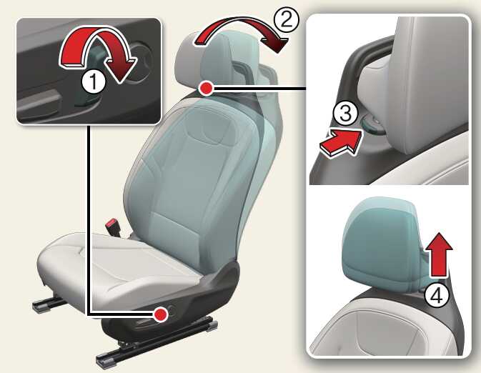 Press the headrest release button (3) while pulling the headrest up (4).