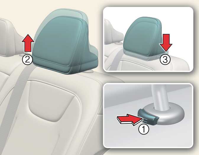 To reinstall the headrest, put the headrest poles (3) into the holes while pressing the release button (1).