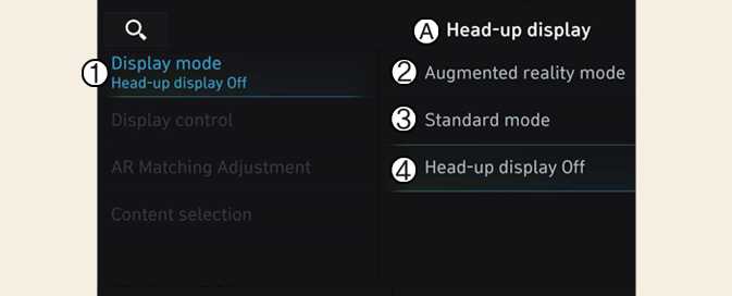Setup → Vehicle → Head-up display → Display mode → Augmented reality mode/ Standard mode