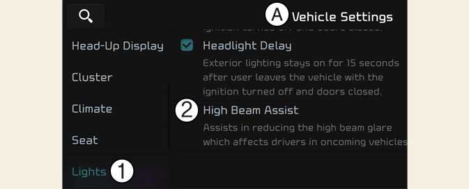 With the vehicle in the ON position, select Setup → Vehicle → Lights → High Beam Assist from the Settings menu to turn on High Beam Assist function.