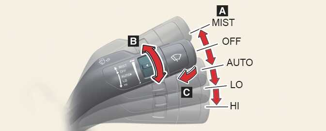 MIST: For a single wiping cycle, move the lever to this (MIST) position and release it. The wipers will operate continuously if the lever is held in this position.