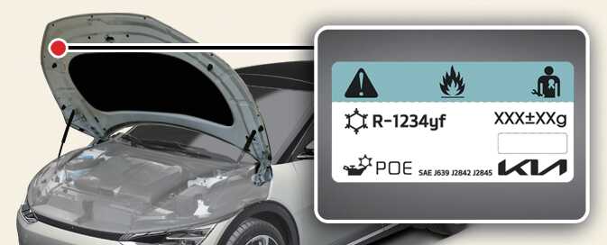 You can find out which air conditioning refrigerant is applied to your vehicle on the label inside of the motor room compartment.